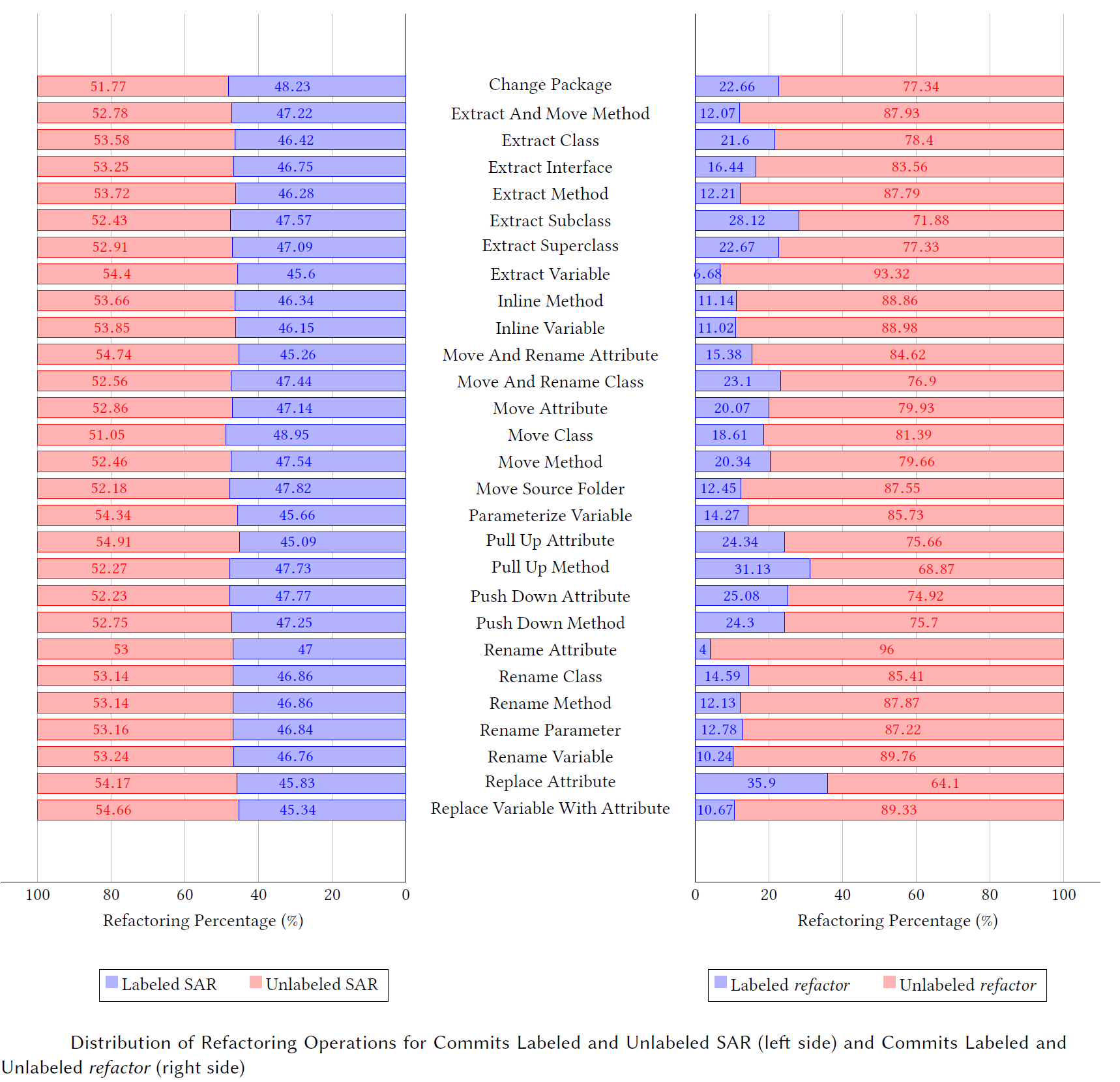 The below figure shows the distribution of refactorings in labeled and unlabeled commits with SAR patterns (group 1 on the left) and labeled and unlabeled commits with the keyword refactor (group 2 on the right). The first observation we can draw is that “Replace Attribute” stands as most labeled refactoring with a percentage of 35.9% for group 2, while the difference between operations percentages, in group 1, is not significant, with “Move Class” having the highest percentage of 48.95%. Another observation is that “Pull Up Attribute” turns out to be the most unlabeled refactoring with a score of 54.91% for group 1, whereas “Rename Attribute” tends to be the most unlabeled refactoring for group 2. This results is consistent with one of the previous studies stating that renames are rarely labeled, as they detected explicit documentation of renames in less than 1% of their dataset [Arnaoudova et al. 2014a]. For both tests, we notice that developers tend to label more refactorings applied to code elements with higher granularity level, i.e., at the package level. Conversely, refactorings that are implemented at method level and at attribute level tend to have the lowest percentage with commits labeled “refactor”. That sheds light on the variety of ways to express refactorings, which depend on the levels of granularity. While it is difficult to find a rationale for such observation, it seems that, making changes at the package and class level requires more exposure to the code design, in comparison with identifier or parameter changes, besides being less frequently to occur, and so when it happens, it is most likely to be documented.