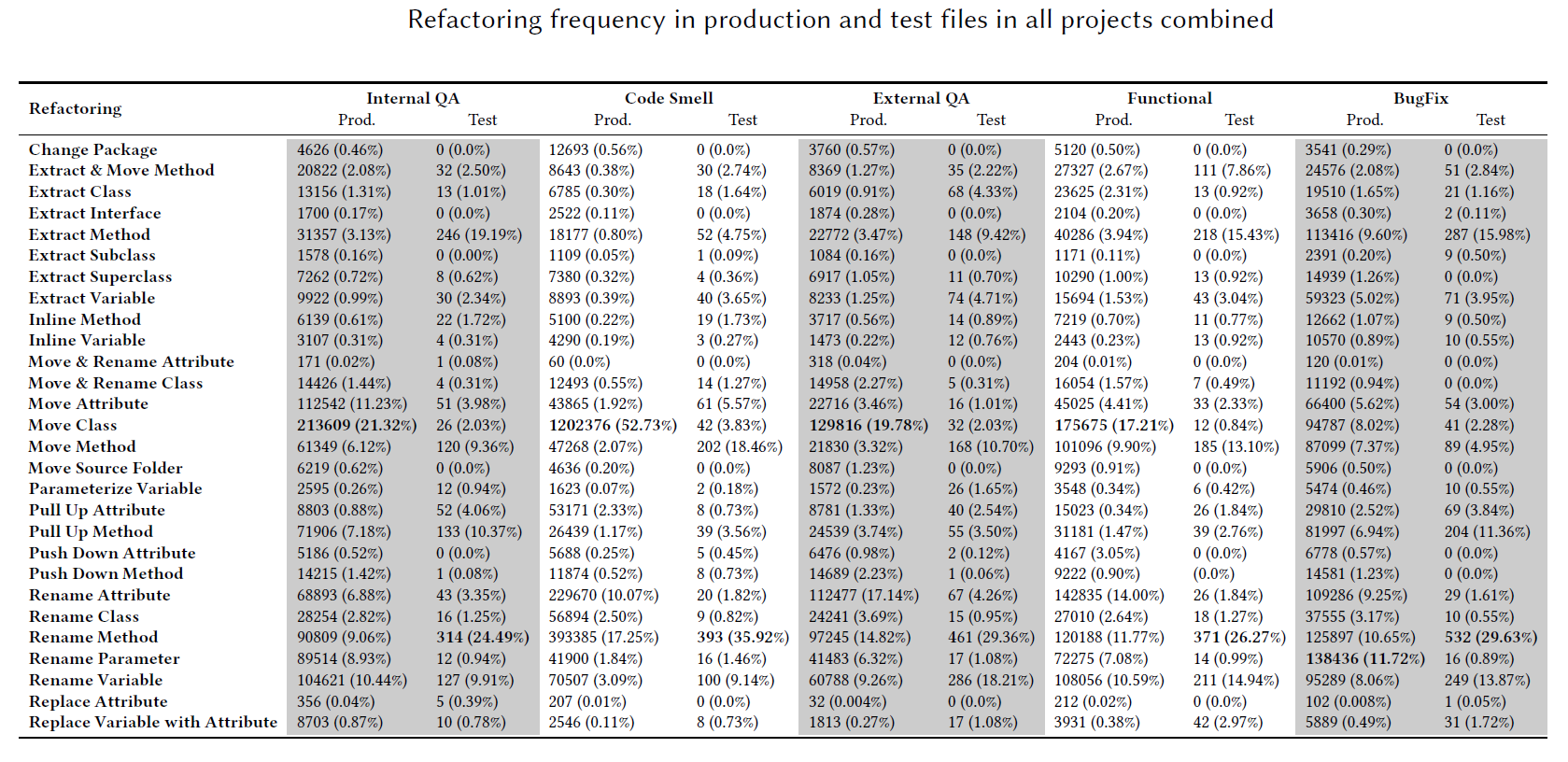 In the below table, we show the volume of operations for each refactoring operation applied to the refactored test and production files grouped by the classification category associated with the file. Values in bold indicate the most common applied refactoring operation – Move Class and Rename Parameter for production files, and Rename Method for test files.